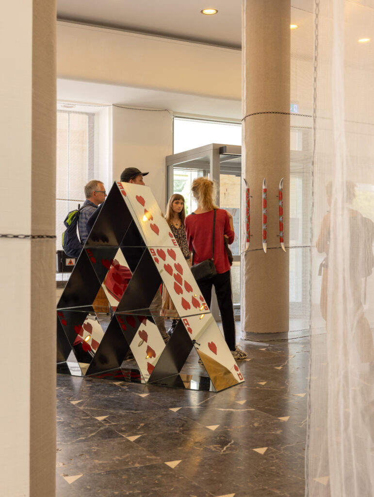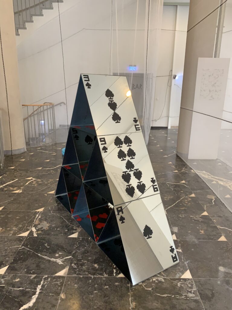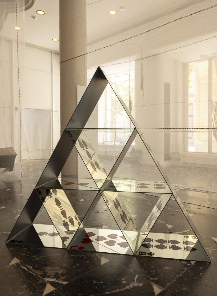 The “House of Mirrors” installation continues the experiment of perception and reflection using mirrors. The triangular structure of mirrors is based on the shape of a house of cards, with pixelated heart and spade patterns applied to each surface. These images are based on familiar playing card symbols, but are reproduced digitally, blurring the line between reality and virtuality.