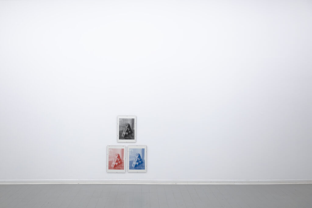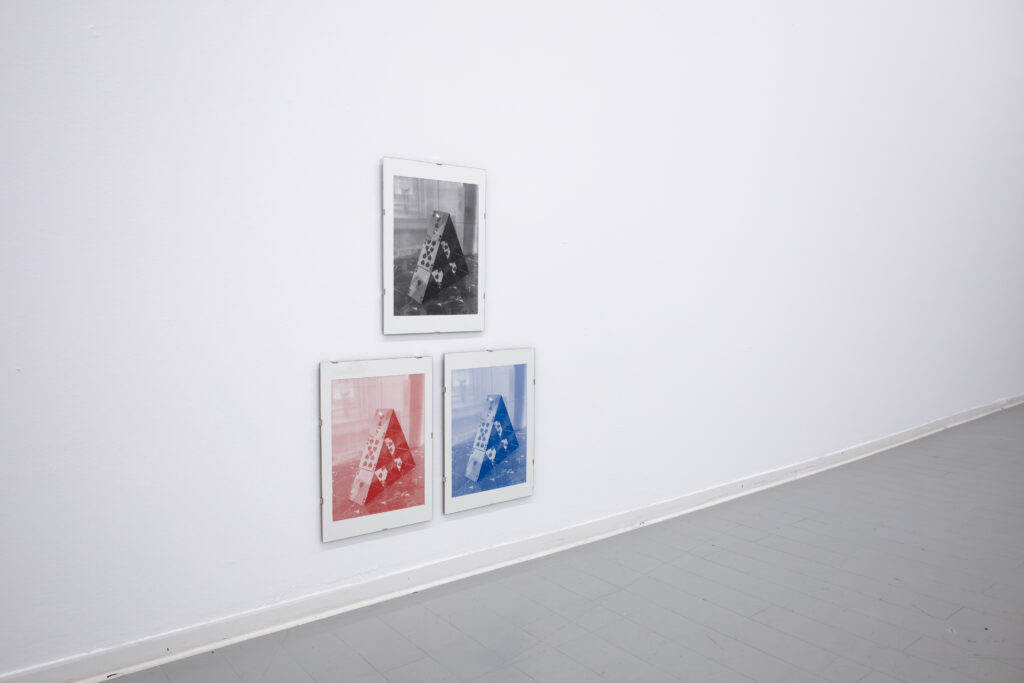 “mirrors of waiting” consists of three silkscreen prints of the same image, each rendered in a different colour: black-and-white, red, and blue. The fragile structure of a house of cards is repeated across different chromatic layers, evoking shifts in time, emotion, and perception. Slight misalignments and the overlap of colours visualise the tension inherent in waiting — suspended between stillness and anticipation, reality and imagination.